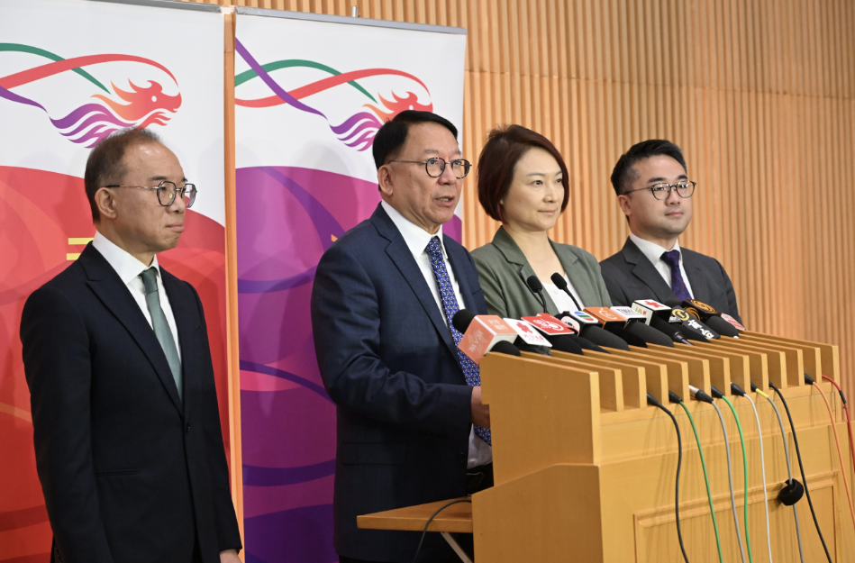 政务司司长陈国基(左二)29日上午出席“宪法和基本法推广督导委员会”辖下的“爱国主义教育工作小组”首次会议后,联同工作小组组长李慧琼(右二)、政制及内地事务局局长曾国卫(左一)和署理教育局局长施俊辉(右一)会见传媒。(政府新闻处)
