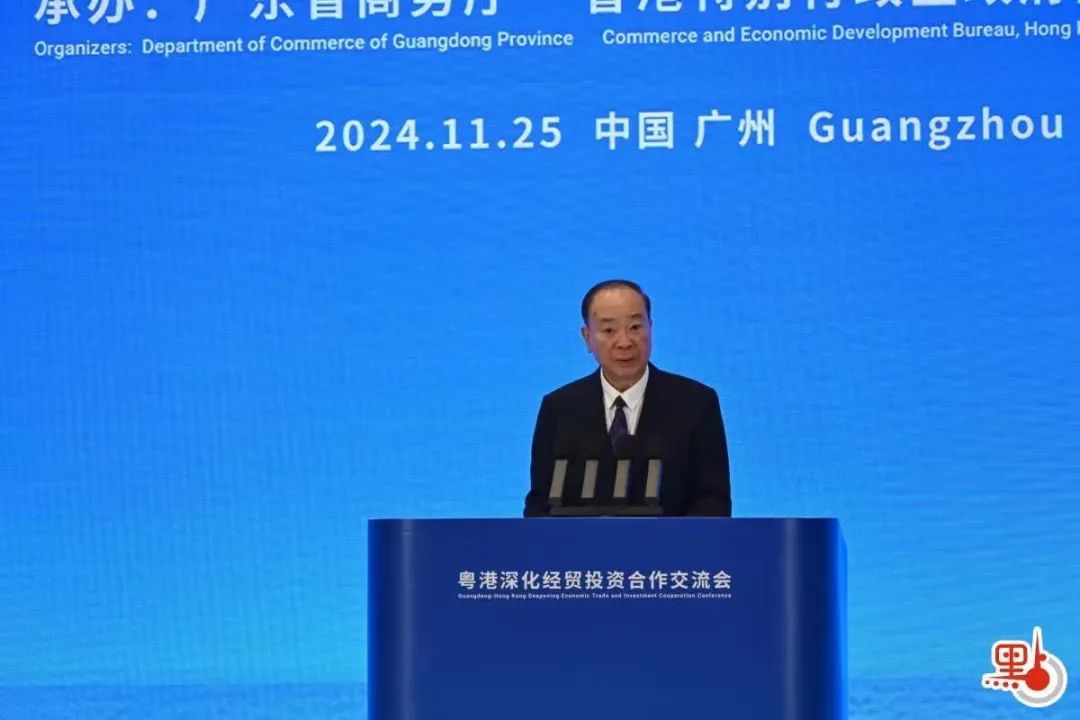 黄坤明在致辞中代表省委、省政府向出席会议的嘉宾表示热烈欢迎,向关心支持粤港合作发展、致力推动粤港澳大湾区建设的各界朋友表示衷心感谢。他说,广东与香港地域相连、人缘相亲,改革开放以来,大批港商来粤投资,既促进香港产业转型升级,也助力广东成长为全国第一经济大省、世界重要制造基地。今年是新中国成立75周年,也是《粤港澳大湾区发展规划纲要》公开发布5周年。站在新的历史起点上,回望这些年的发展历程,我们更加深刻认识到,一个稳定的、强大的中国始终是粤港携手并进、开创美好未来的底气所在,一个世界级湾区、发展最好的湾区始终是粤港携手并进、开创美好未来的机遇所在,一个风雨同舟、相互成就的兄弟始终是粤港携手并进、开创美好未来的力量所在。当今之广东,正围绕实现习近平总书记赋予的使命任务,以活跃跃的实践探索展开对中国式现代化的精彩演绎,从推进产业科技互促双强、发展新质生产力,到实施“百县千镇万村高质量发展工程”促进城乡区域协调发展,从打造“海上新广东”,到推动绿美广东生态建设,从实施“民生十大工程”,到扎实推进共同富裕,都将释放巨量需求、带来巨大红利,成为创新创业创造的最佳舞台。放眼世界,粤港澳大湾区基础条件好、综合优势强、政策利好多,发展前景无限美好,投资大湾区,就是投资大未来。希望广大香港企业坚定信心、抓住机遇,扎根大湾区、深耕大湾区,积极来粤投资实业、投资科技,发挥优势服务好香港“超级联系人”和“超级增值人”的功能,助力粤港拼船出海,在与粤港共成长中成就事业、成就梦想。希望大家当好桥梁,面向香港同胞、国际友人讲好中国故事、大湾区故事、广东故事,吸引更多人前来参观游览、投资兴业。广东省委、省政府将一如既往支持香港企业在粤发展,加力推进一流营商环境建设,致力构建完善的市场、产业、企业和服务体系,让大家倾心而来、安心发展。
