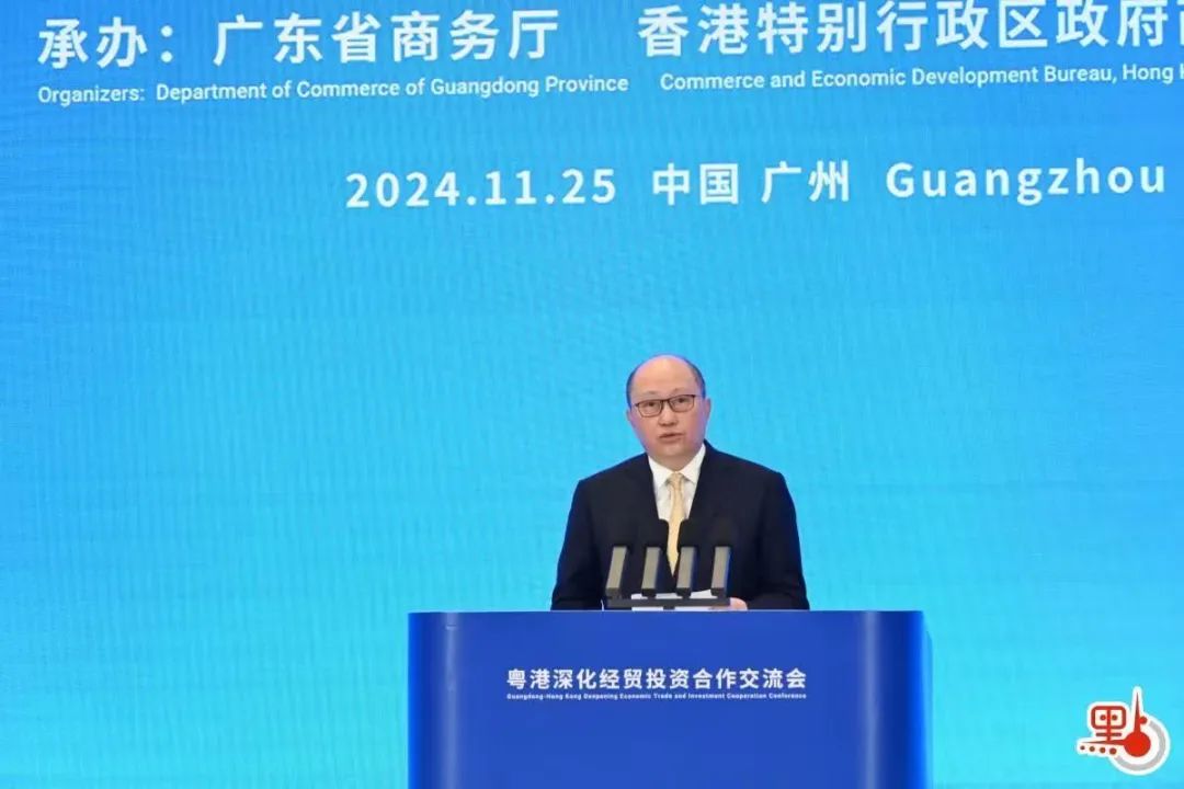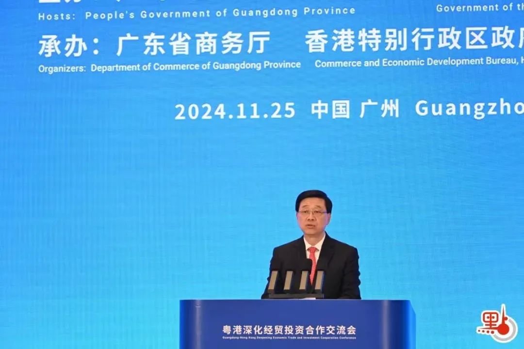 李家超在致辞中表示,建设粤港澳大湾区是习近平主席亲自谋划、亲自部署、亲自推动的重大国家战略。如今的大湾区,已经成为中国开放程度最高、经济活力最强的区域之一,为全球投资者带来了无限机遇。香港与广东地域相邻、同根同源、唇齿相依、往来密切,近年来两地秉承互利共赢原则,聚焦将粤港澳大湾区打造成为新发展格局的战略支点、高质量发展的示范地、中国式现代化的引领地这个重点,在不同领域开展全方位紧密合作并取得丰硕成果。在“一国两制”框架下,香港具有“背靠祖国、联通世界”的独特优势,将积极融入国家发展大局,全力打造国际金融、航运和贸易中心,积极发展创新科技、文化艺术等新兴产业,继续推动香港与大湾区城市强化基础设施互联互通、产业协同发展,实现更高水平的共赢发展。一直以来,粤港工商界是粤港经贸投资合作的参与者、受益者、贡献者。今天大家共聚一堂,签署一批高质量合作项目,充分彰显携手服务国家发展的家国情怀和推动粤港经贸合作向纵深发展的信心决心,希望大家携手并进,一起为把粤港澳大湾区建设成为国际一流湾区和世界级城市群奋发向上、共同努力,推动形成更多更富成效的经贸合作成果。香港特区政府将全力做好服务,充分发挥“超级联系人”和“超级增值人”的功能,推动香港与广东企业一起携手走向世界,同时吸引更多海内外企业投资大湾区,为以中国式现代化全面推进强国建设、民族复兴伟业作出新的更大贡献。
