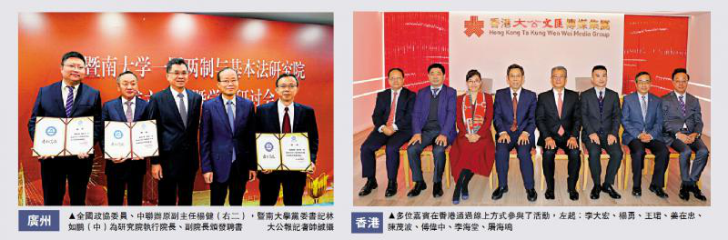 暨南大学“一国两制”与基本法研究院成立仪式暨学术研讨会27日在广州举行,活动还在香港设立在线分会场,北京、香港等地有关人士通过网上视频联机方式共同参加。全国政协委员、香港中联办原副主任杨健,暨南大学党委书记林如鹏,全国港澳研究会副会长兼秘书长曾健等嘉宾致辞。