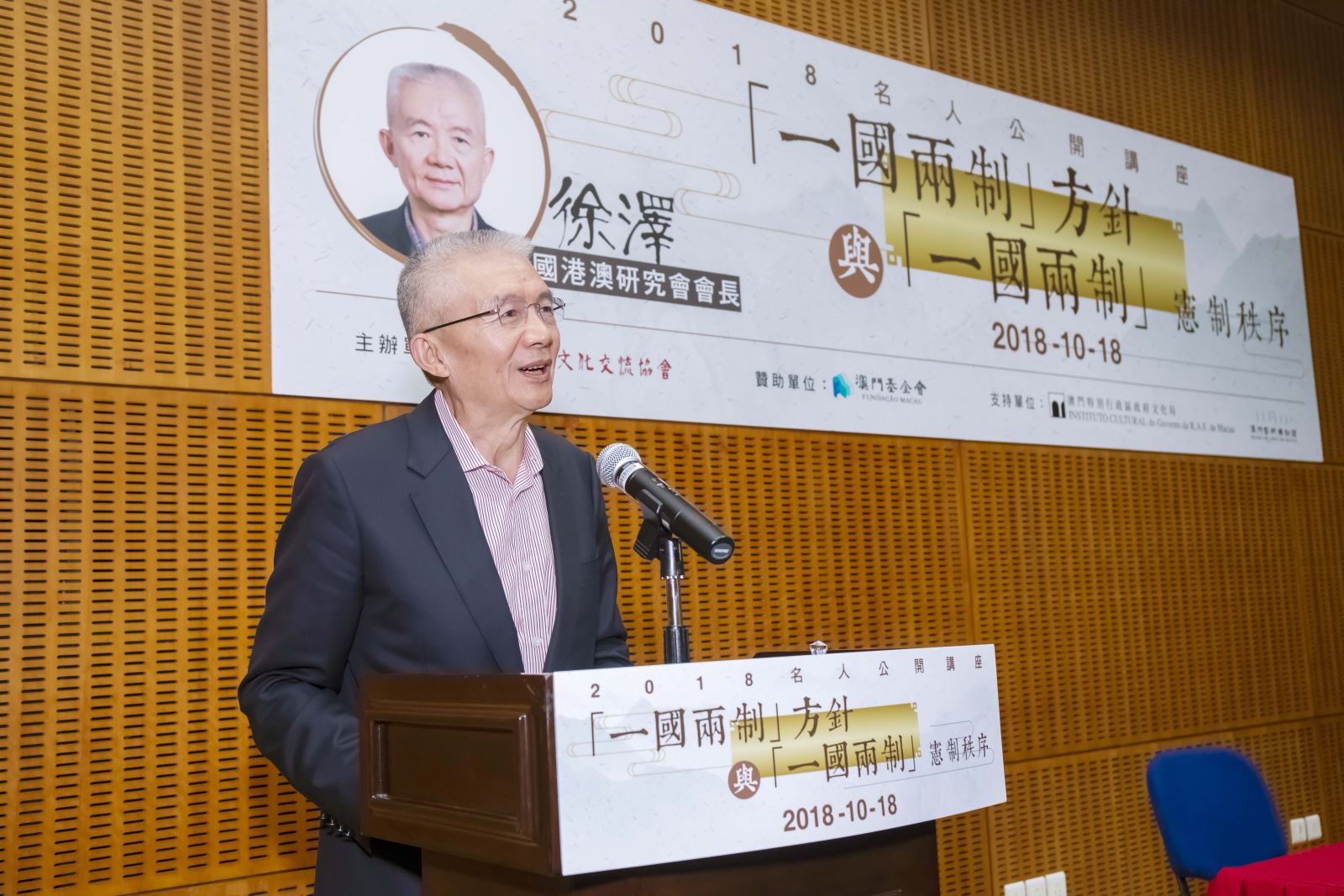 10月18日下午,徐泽会长受澳门中华文化交流协会邀请,在 “2018名人公开讲座”上发表题为《“一国两制”方针与“一国两制”宪制秩序》的主题演讲。此次公开讲座旨在使澳门公众对“一国两制”方针与“一国两制”宪制秩序有更清晰的认知。来自特区政府、工商界、教育界等逾百人参加,其中不乏中学生。