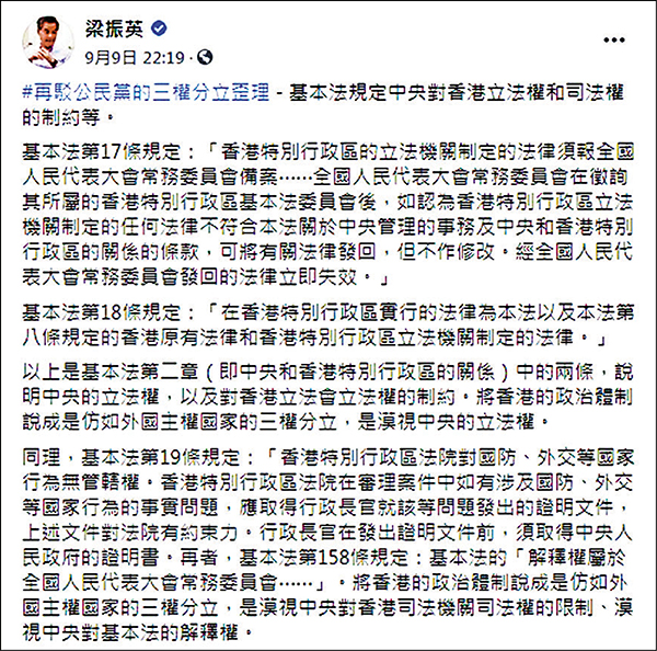 「三权分立」常用于形容主权国家的政治架构,不适用于香港,基本法亦清楚表达香港的政治架构是行政主导,但公民党仍不断声称「『三权分立』由基本法订明」,企图误导市民。全国政协副主席梁振英再在facebook发文,驳斥公民党的歪理。他引用有关的基本法条文,指出基本法规定中央可以限制香港立法权和司法权,声称香港是「三权分立」是漠视中央的立法权以及对基本法的解释权。